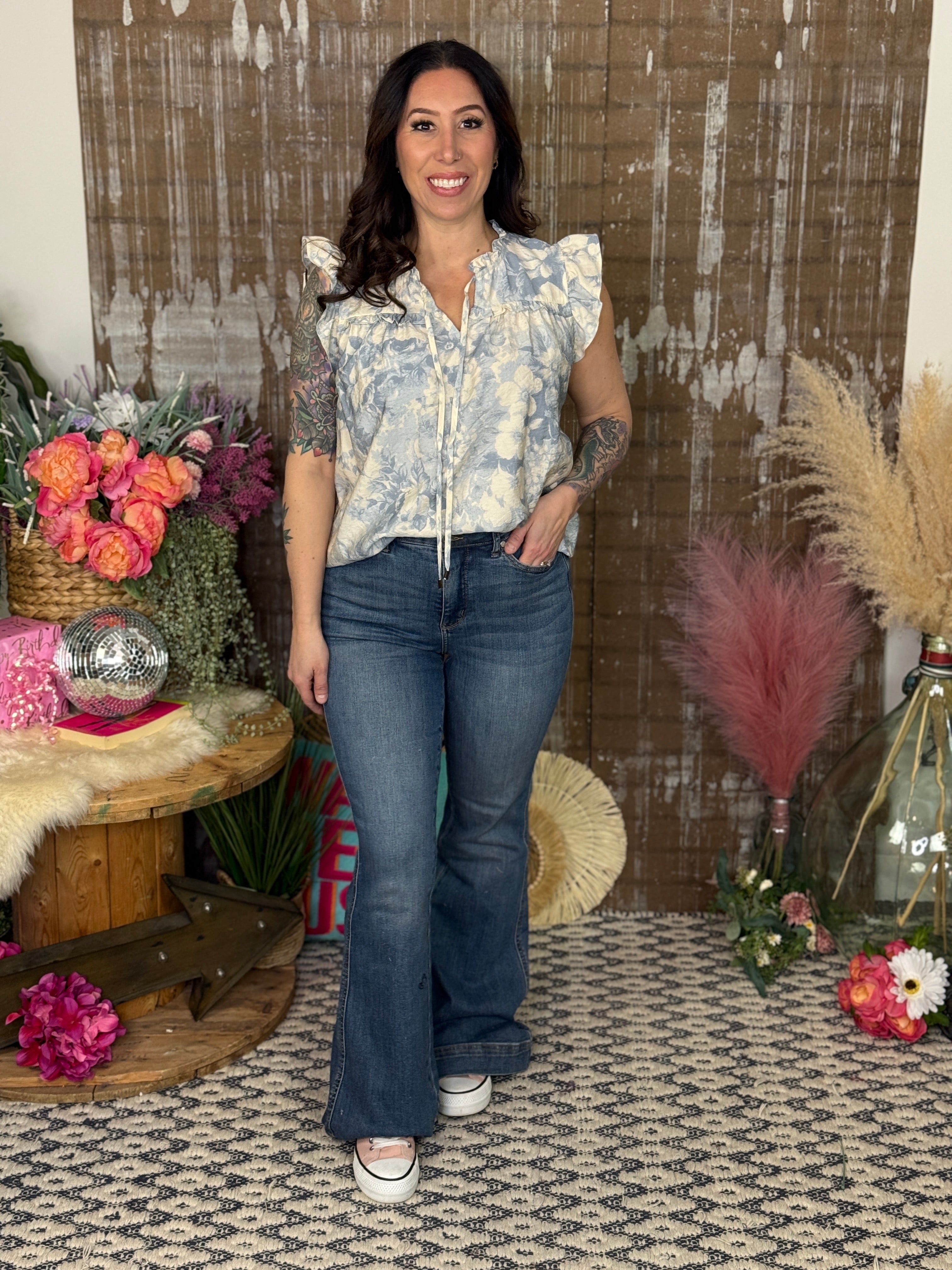 Sky Blue Floral Ruffle Top (Small - 3X)