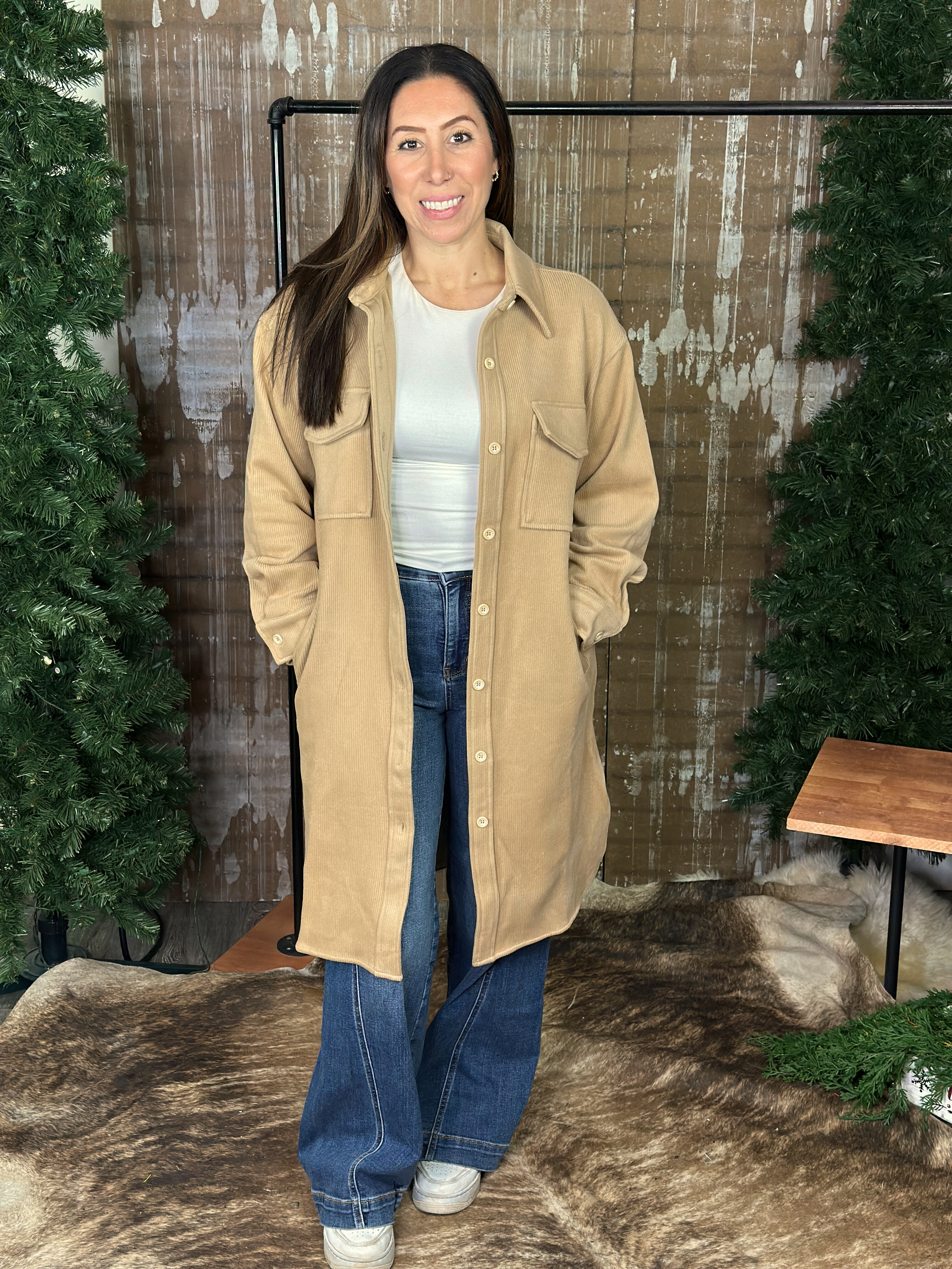 Relaxed, long shacket, super soft. Functional buttons and pockets.