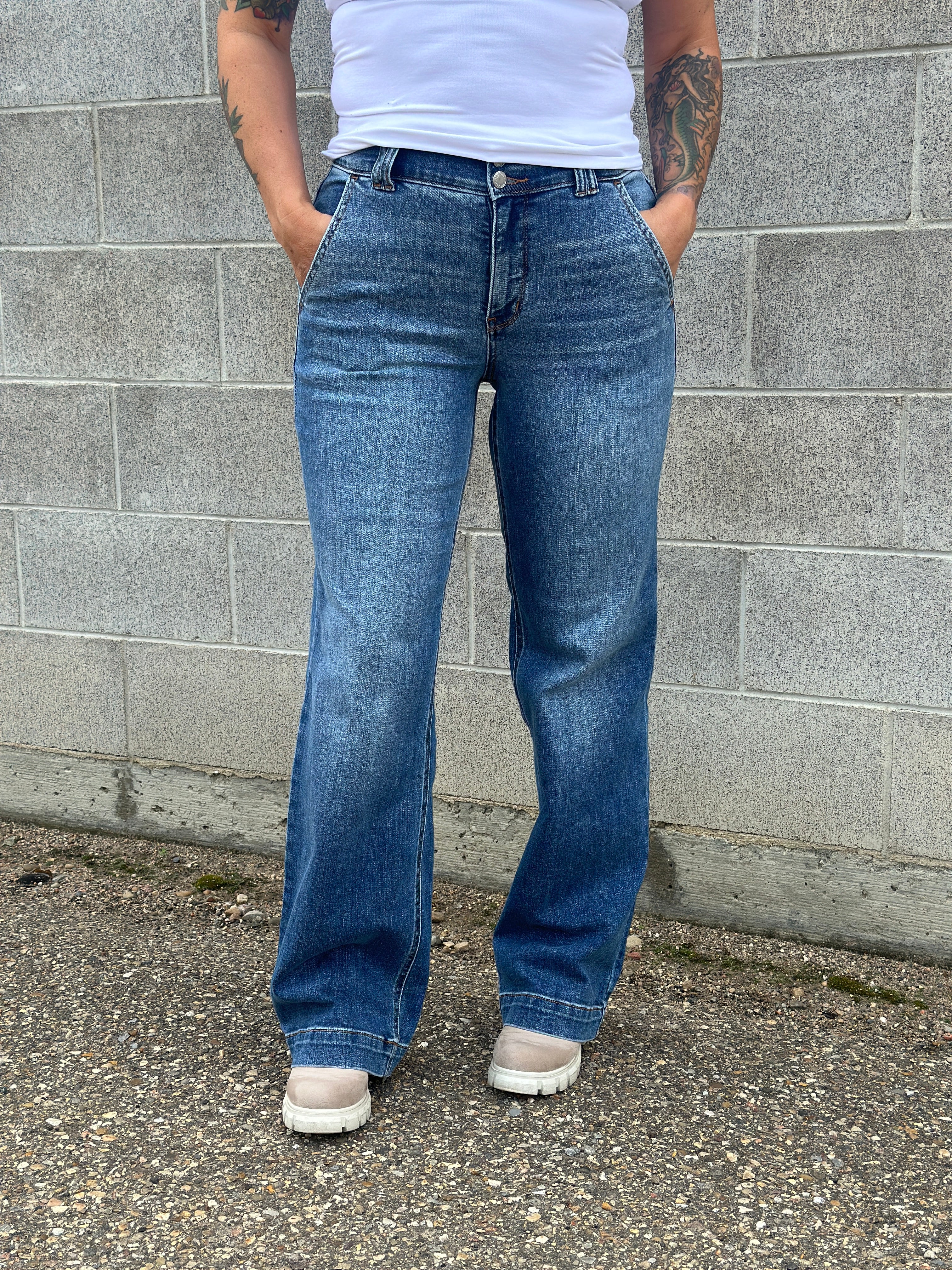 Fit: A super stretchy wide leg, mid rise jean. Double button with slanted seam pockets.