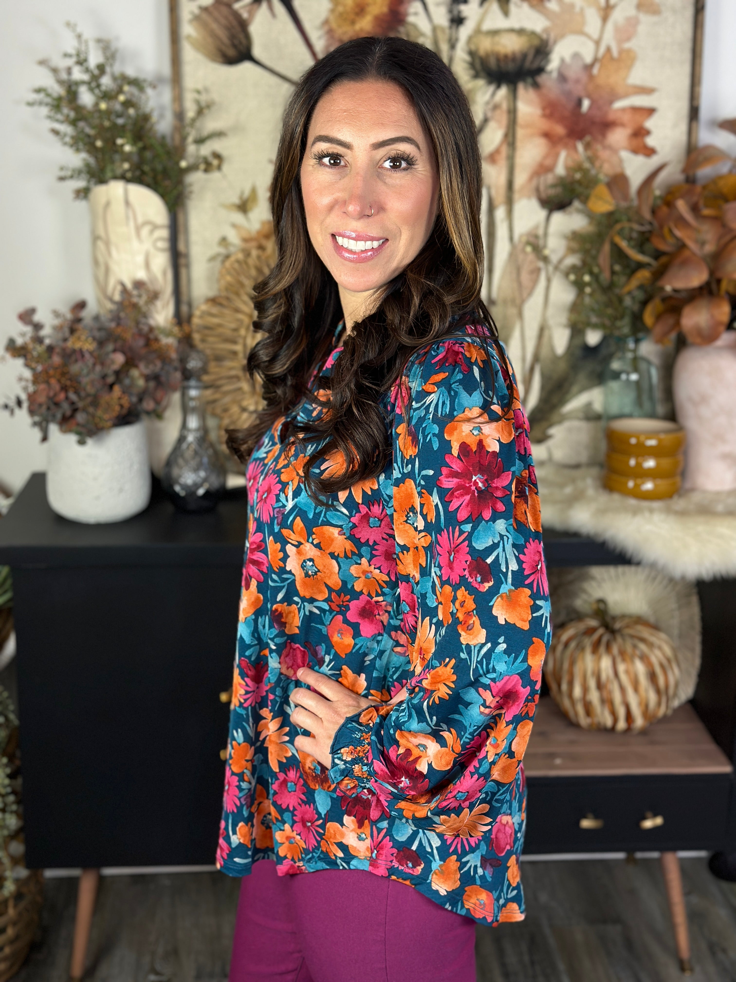 The Ruched 3/4 Sleeve Lizzie Top - Teal Bright Floral