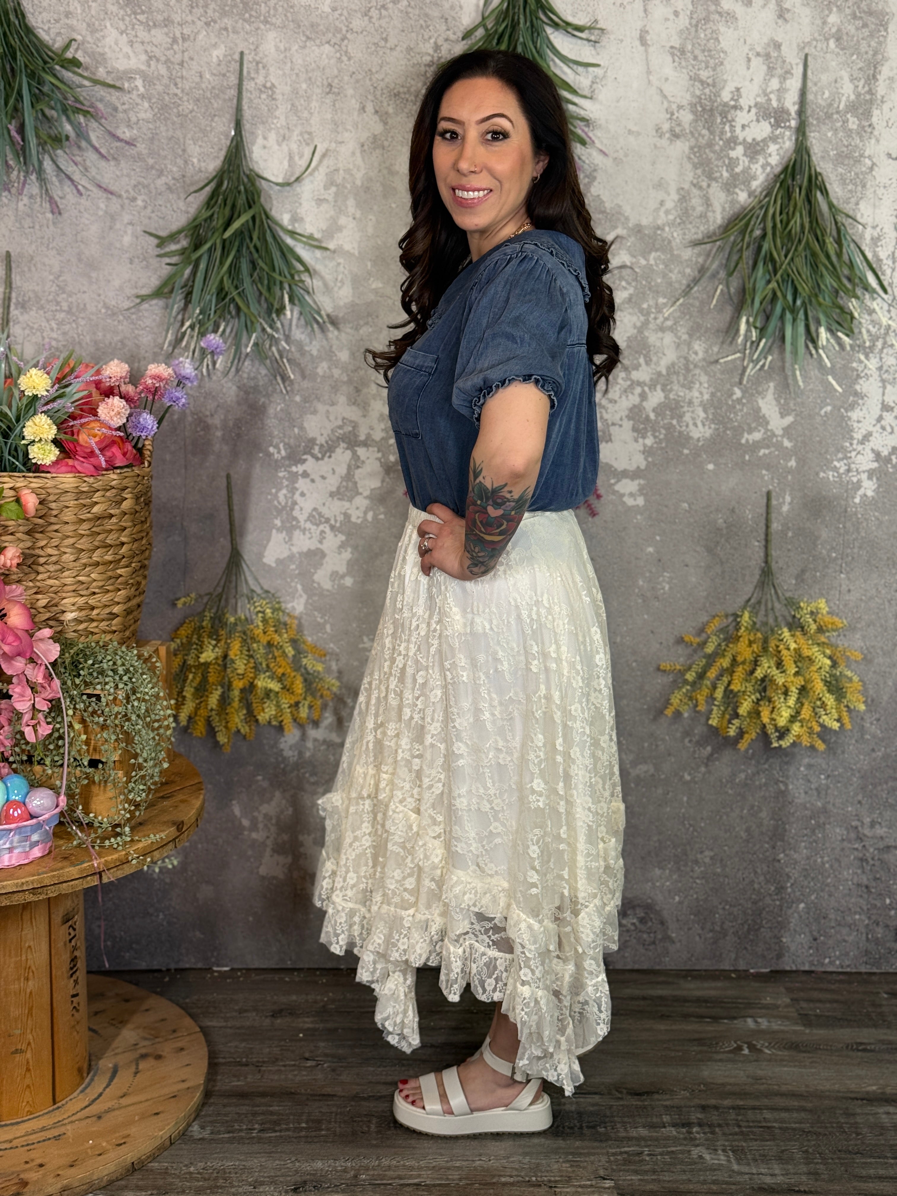 A relaxed fitting, asymmetrical skirt.