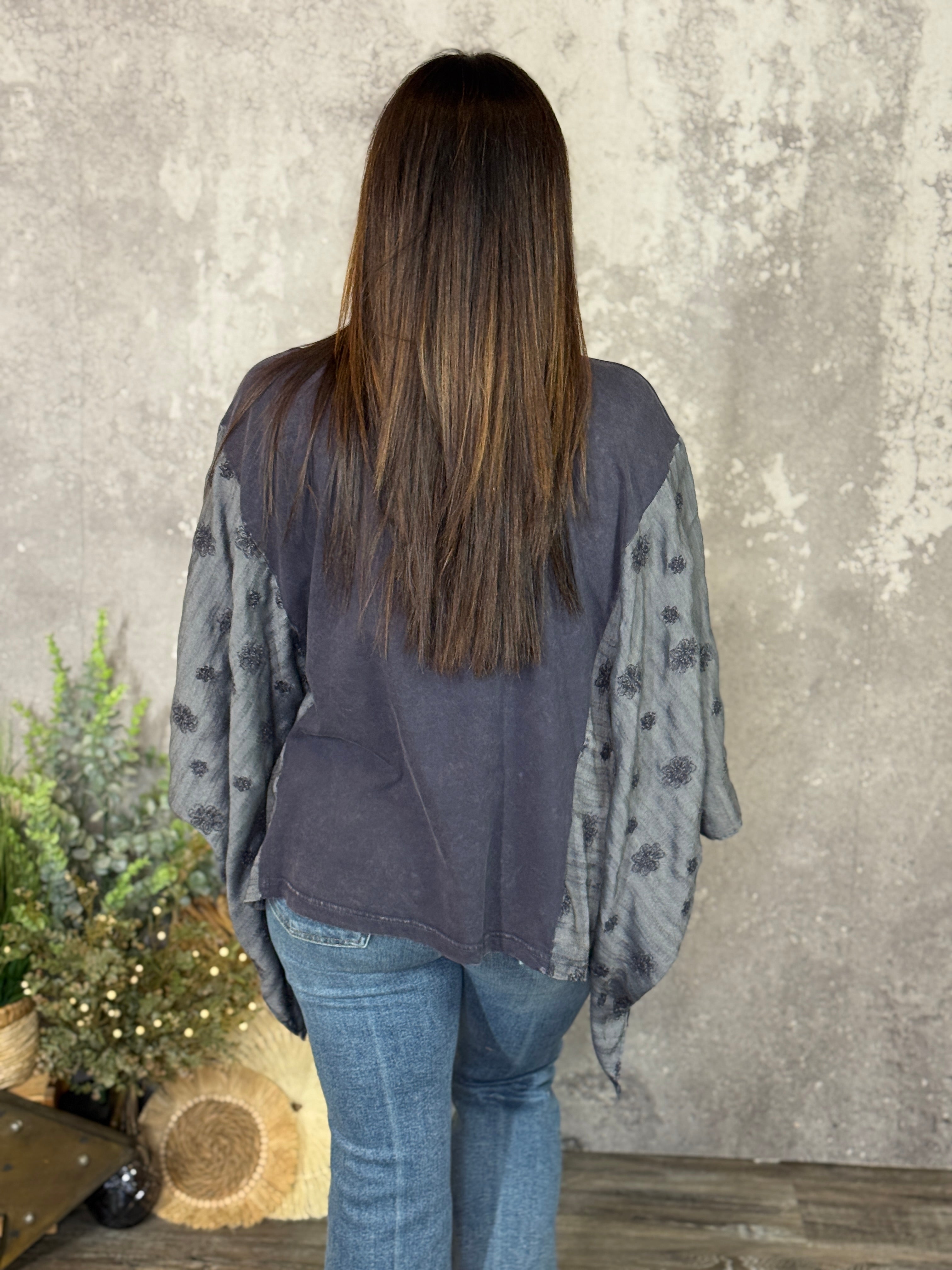 Fit: Oversized flowy kimono top with peace sign detail.