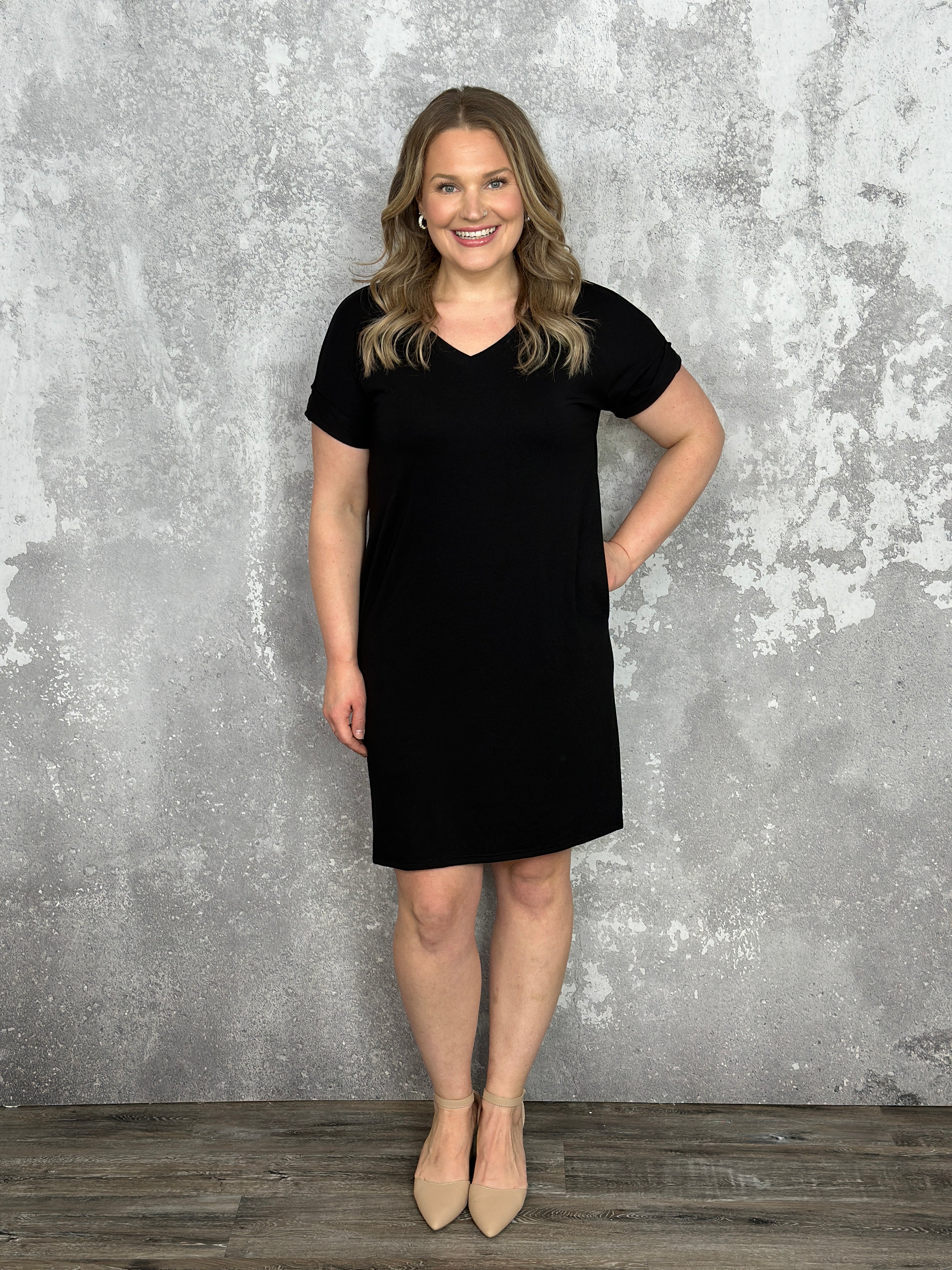 Fit: A super soft relaxed fitting tshirt dress with pockets! This one is a vneck!