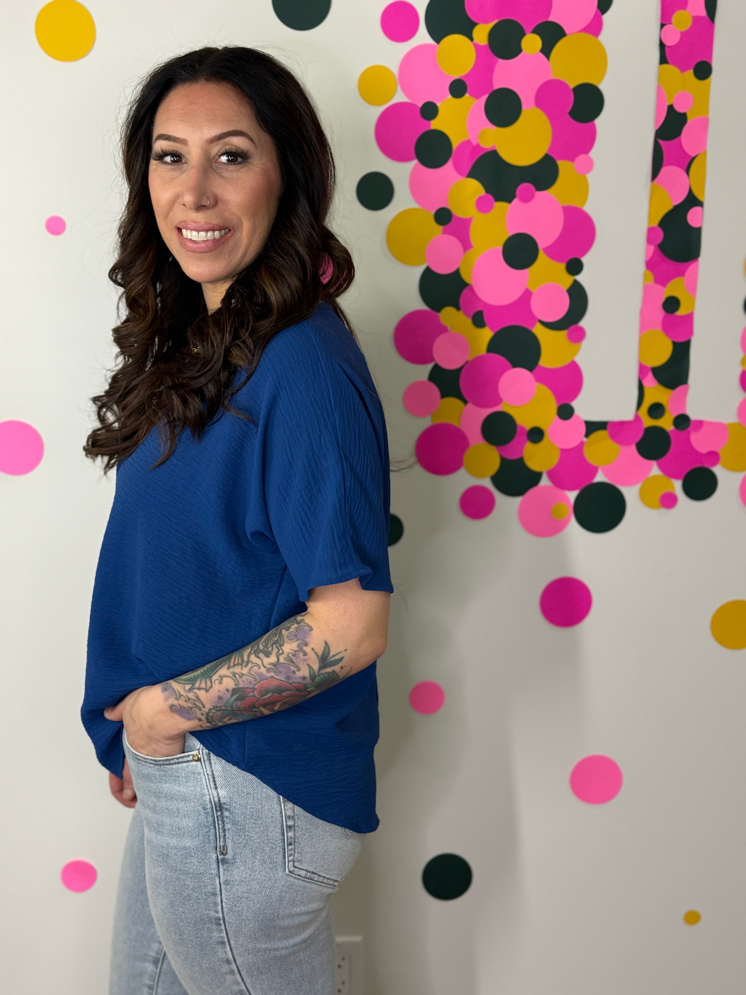 Fit: A relaxed airflow top with vneck. Easy breezy basic.