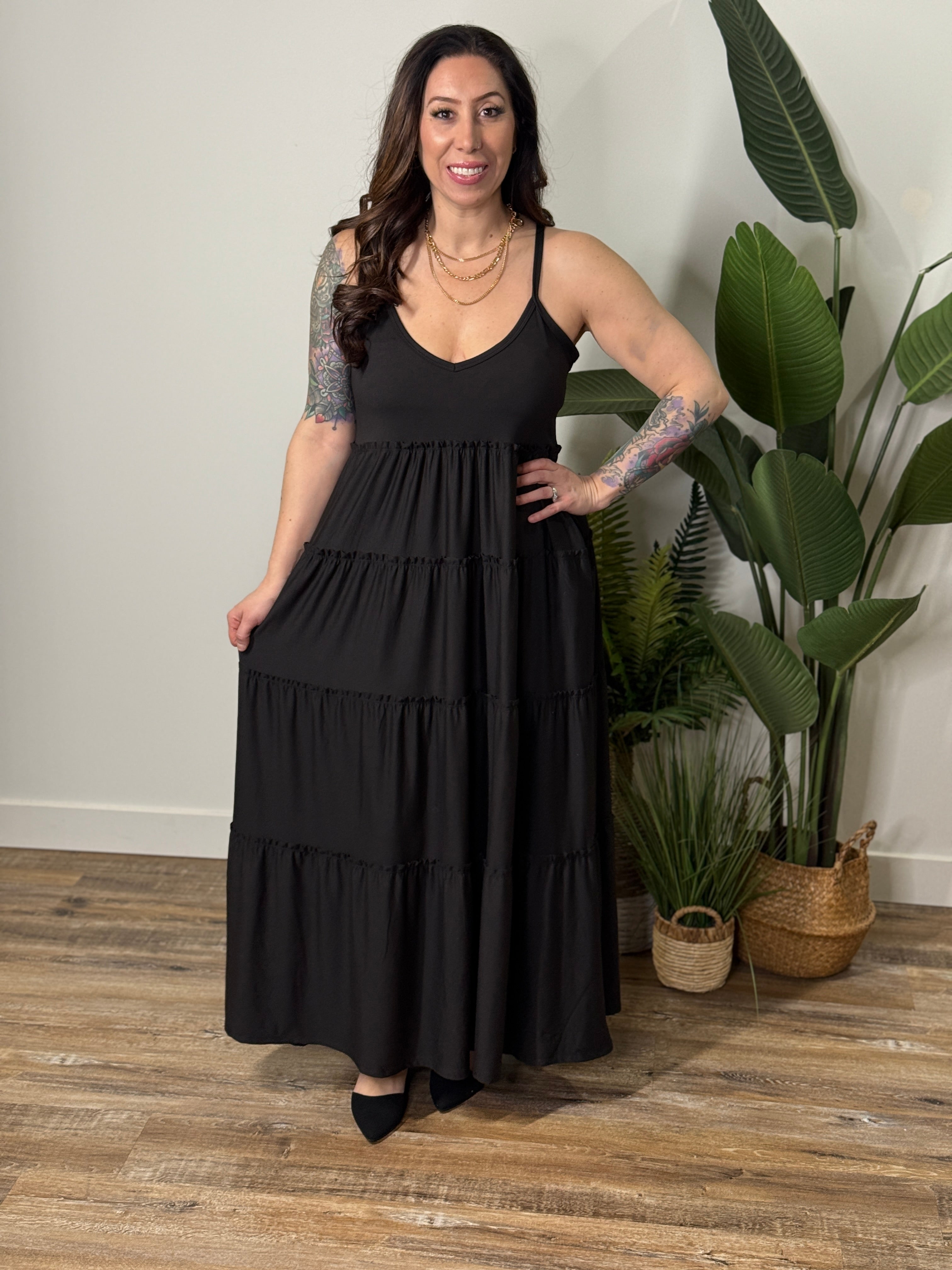 Fit: A super soft adjustable strap tiered maxi dress. Relaxed fit.