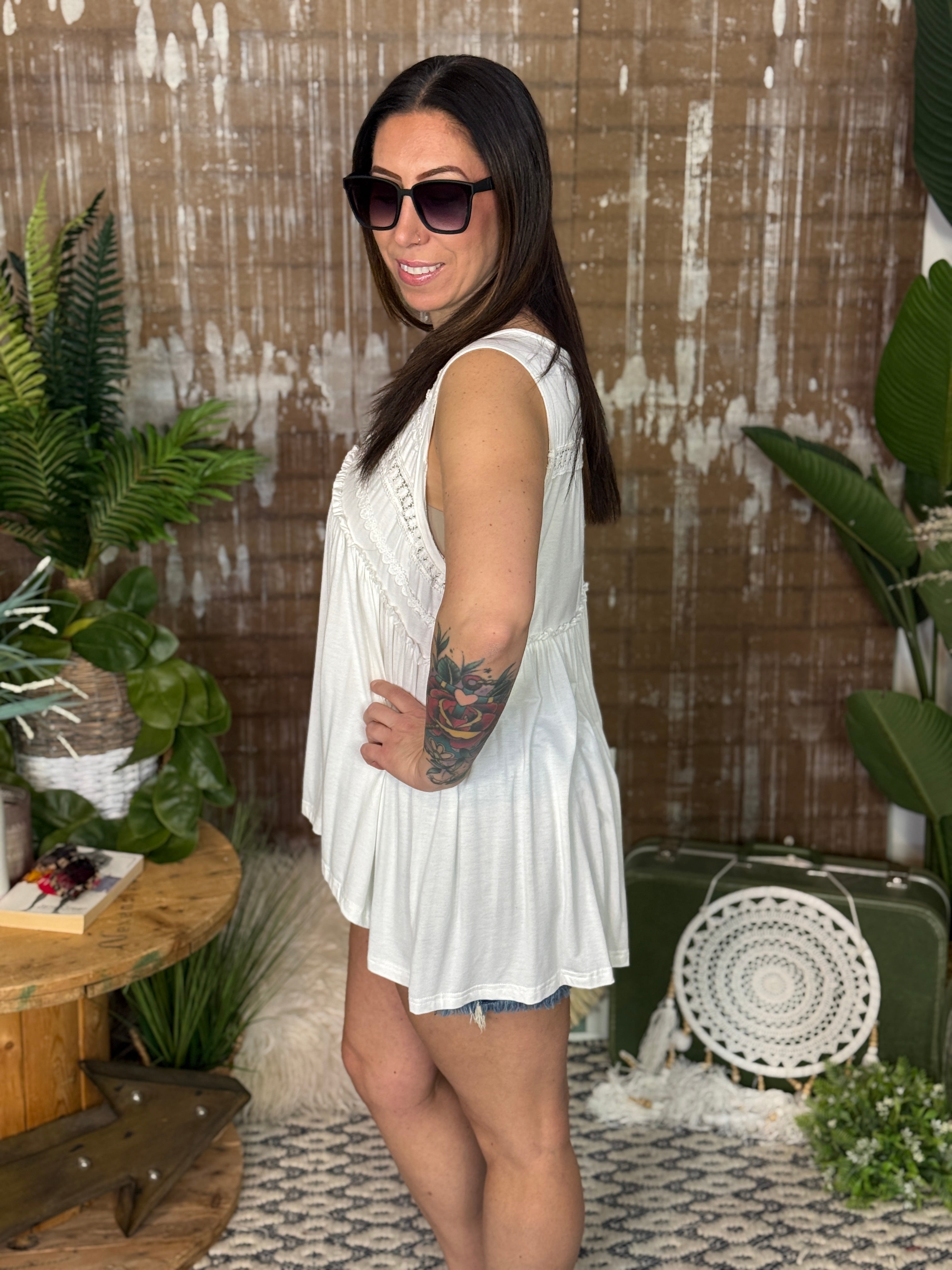 Fit: Soft, relaxed fitting babydoll top with crochet detail. Flowy fit.
