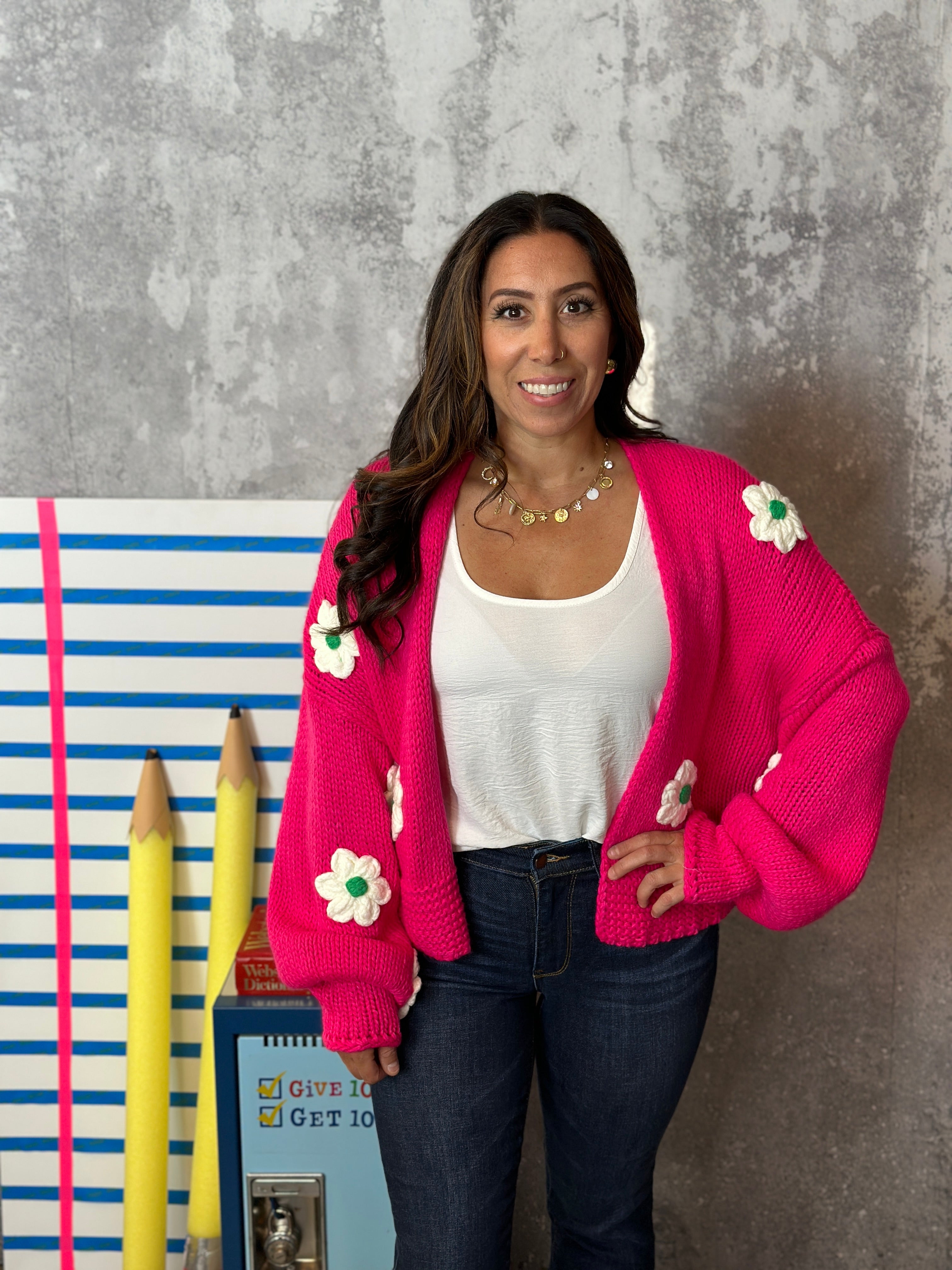 A modest cropped cardigan with 3D floral detail. Could size down for a more fitted look.