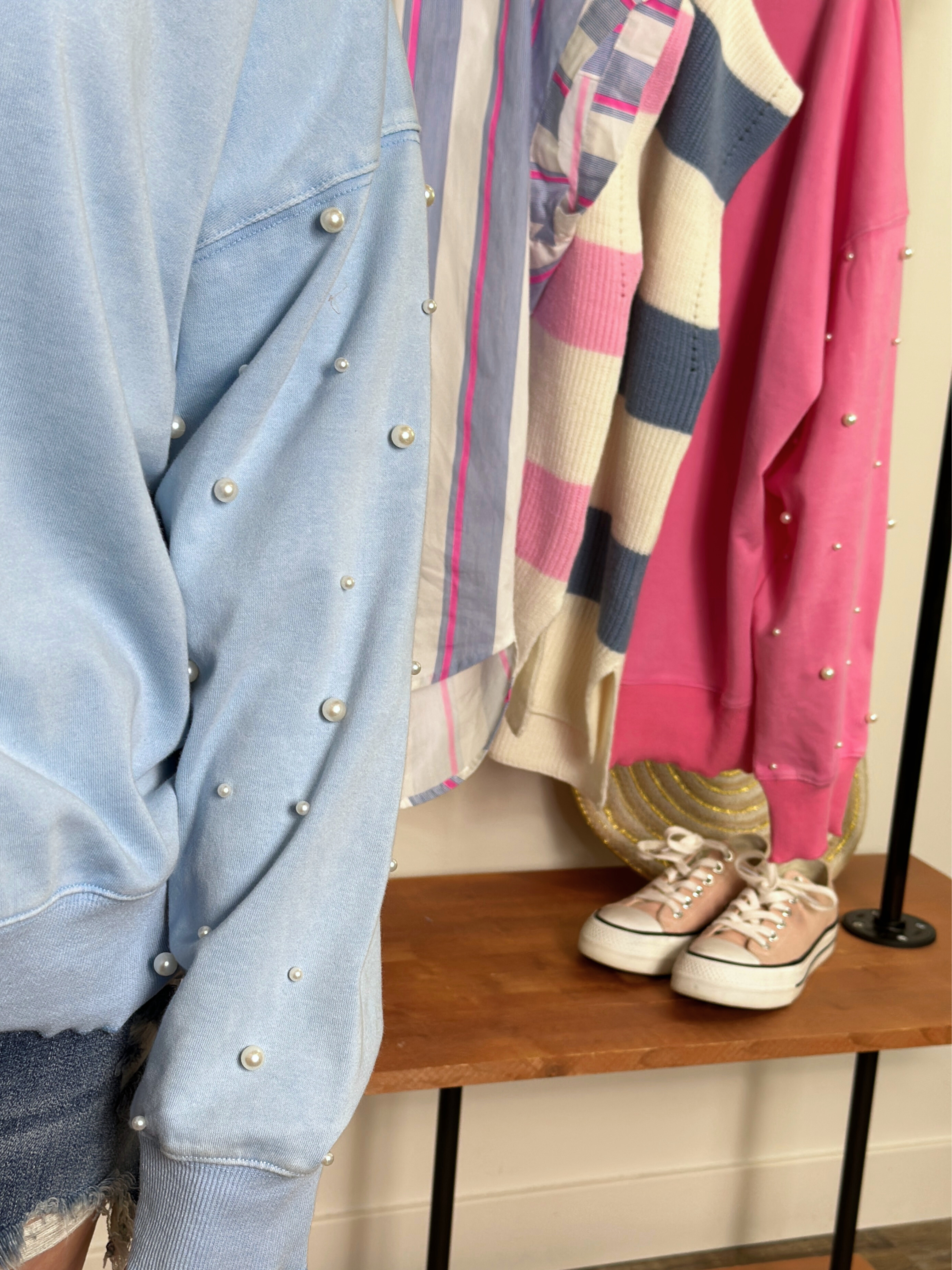 Fit: Oversized sweatshirt adorned with all over pearls on the sleeves. Could size down for a more fitted look.