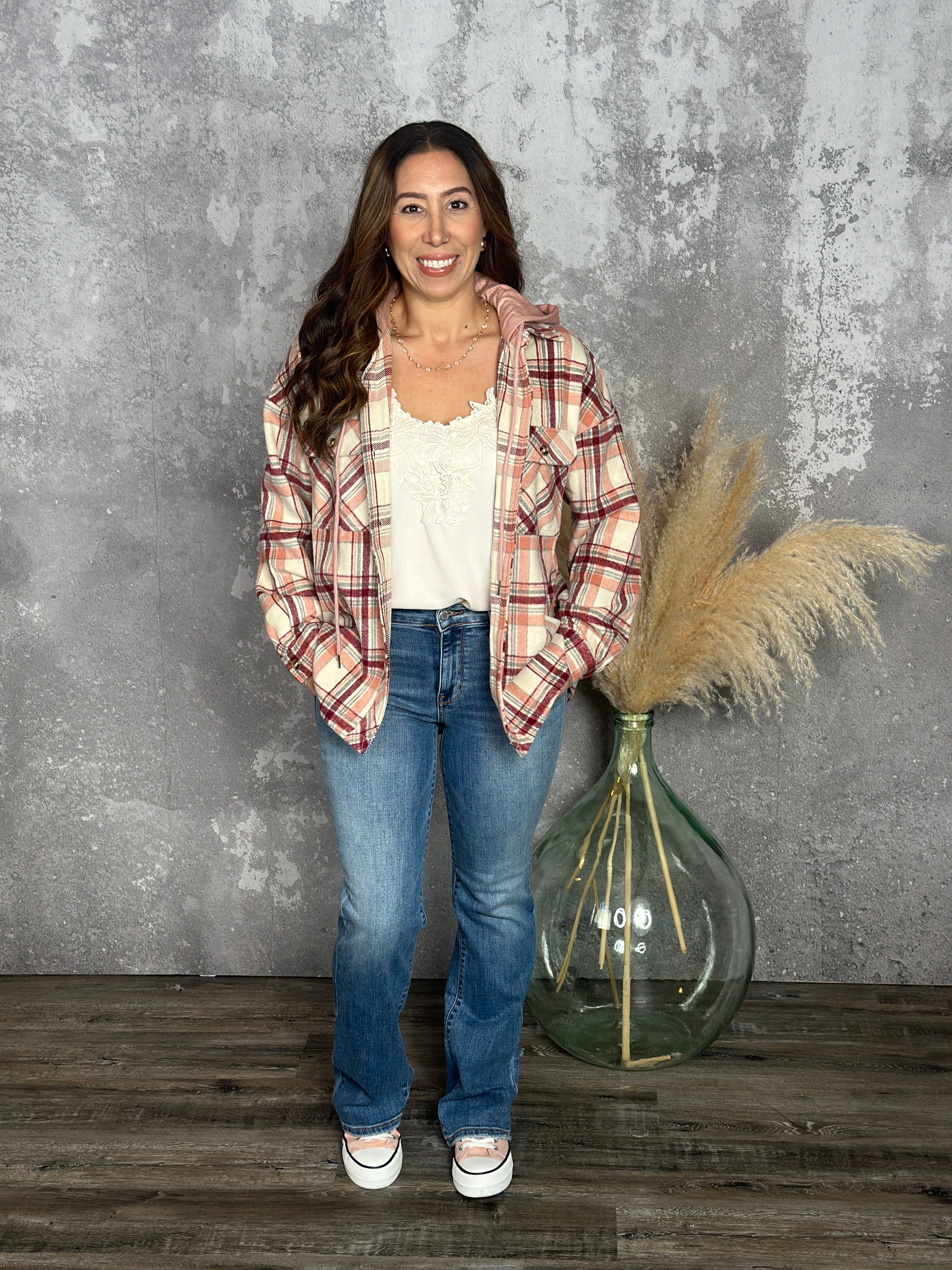 Fit: Relaxed true to size button up lightweight shacket with hood. Featuring a button closure.