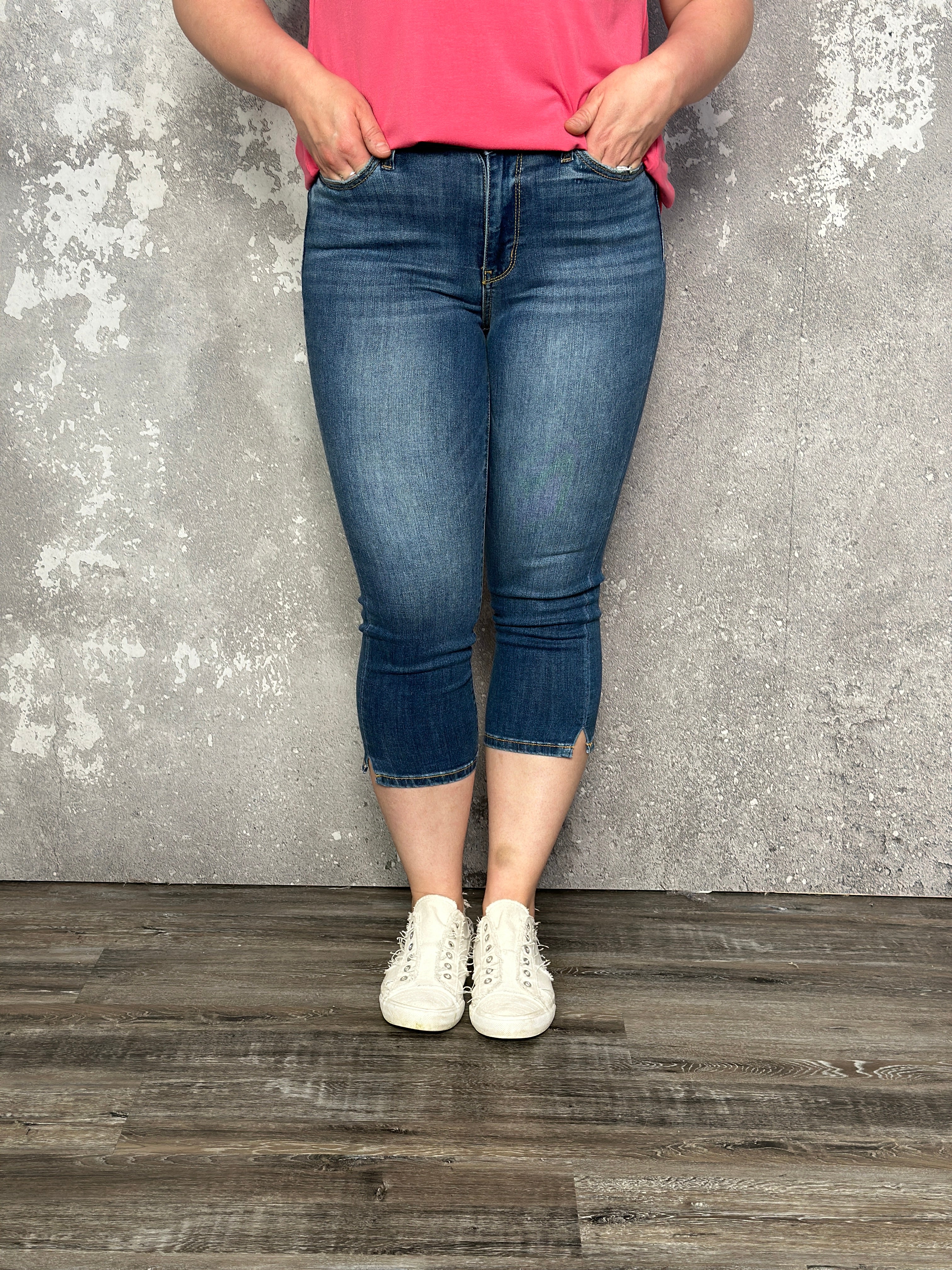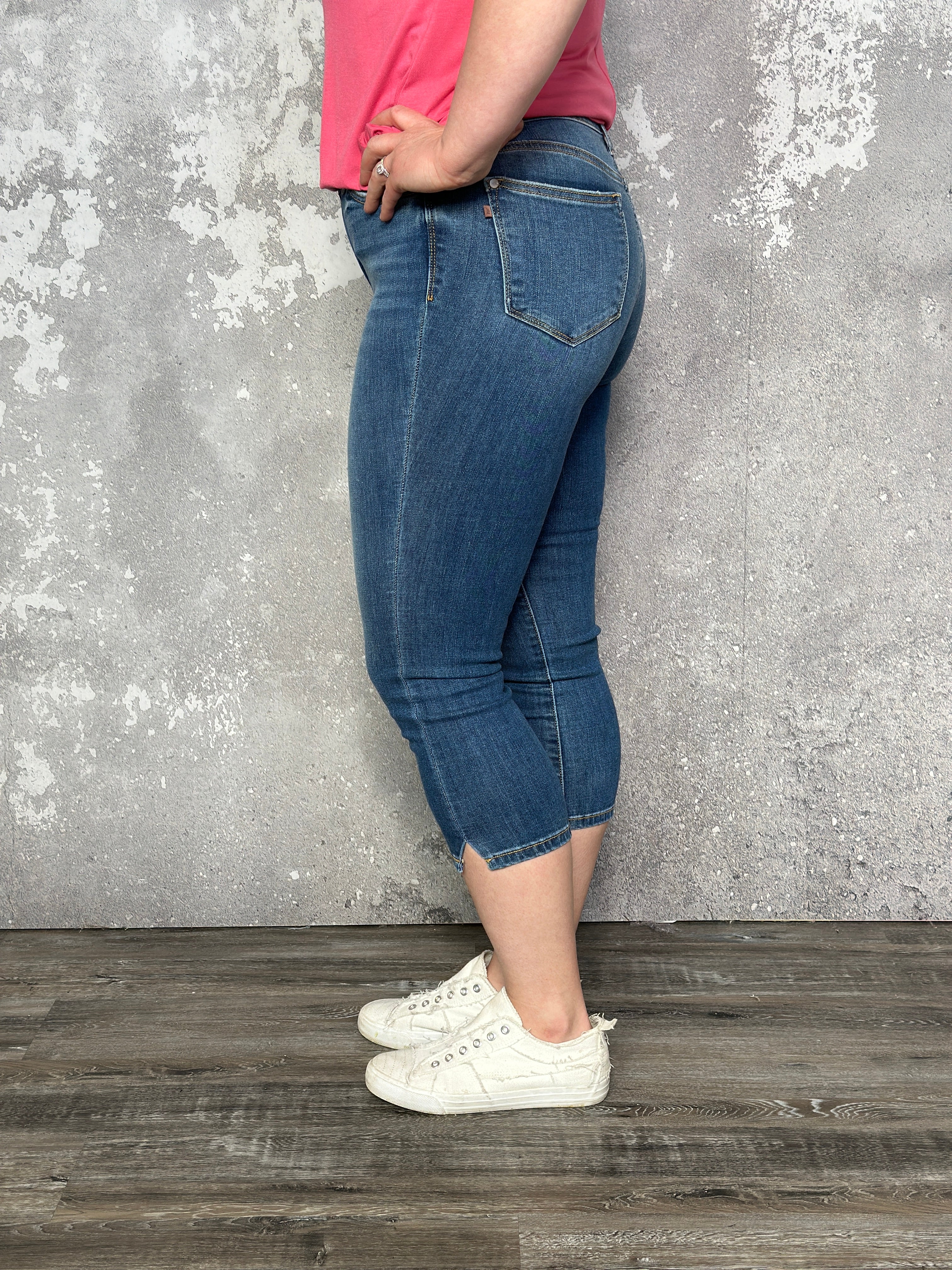 Fit: A skinny fitting mid rise capri jean. With functional pockets, button and zipper fly. Featuring a side slit at the bottom for a flattering look.