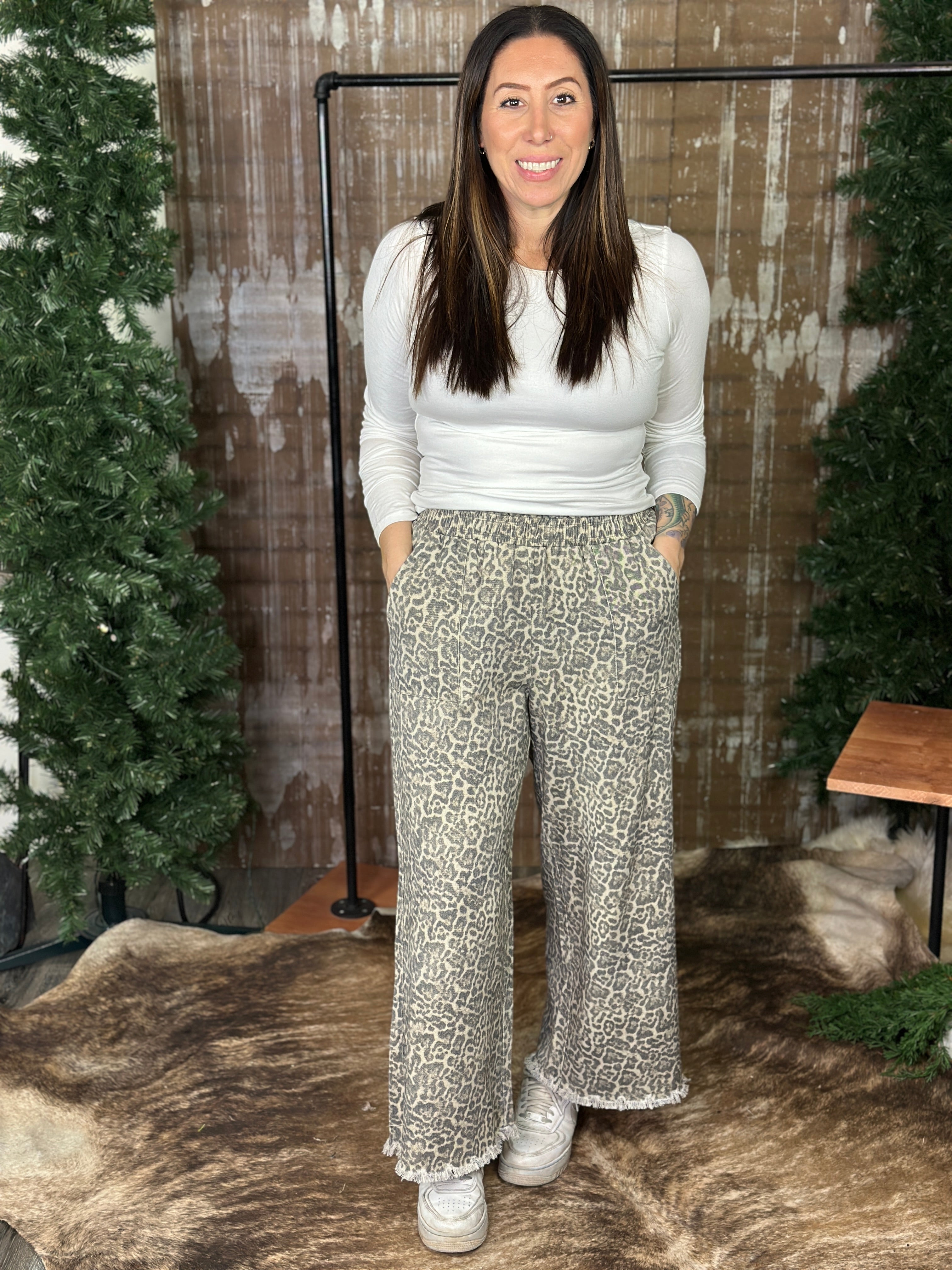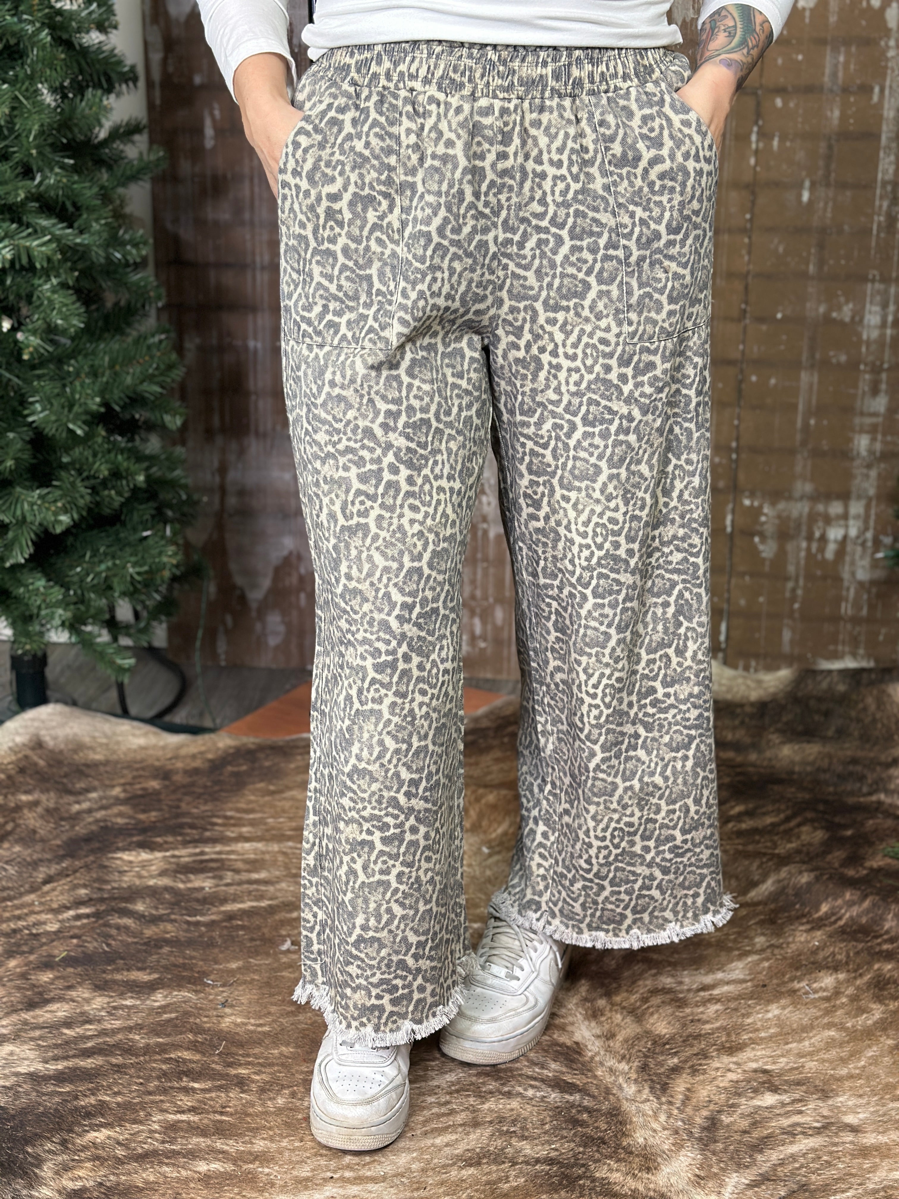Fit: Elastic waisted slightly cropped lightweight denim wide leg leopard pant.
