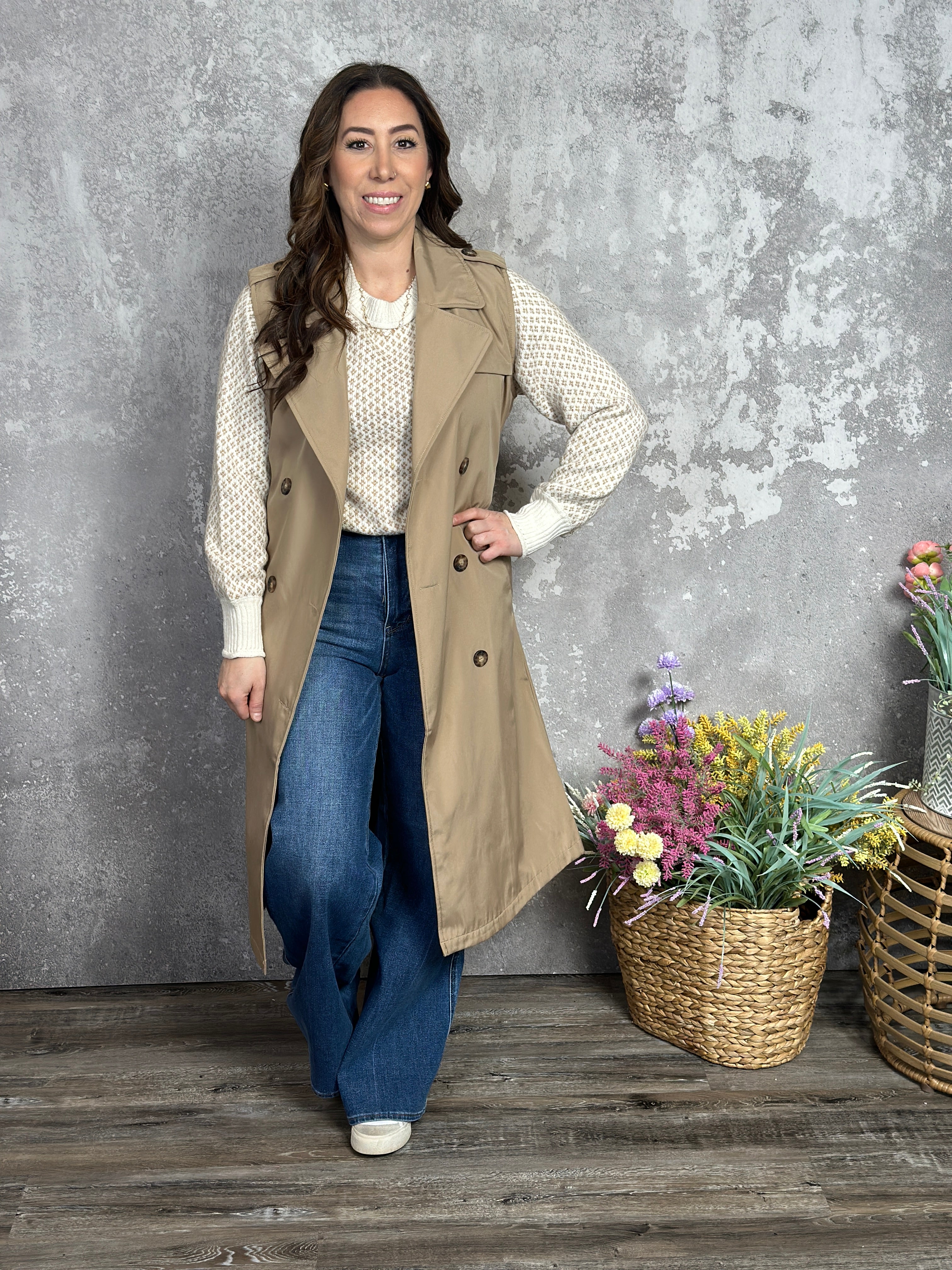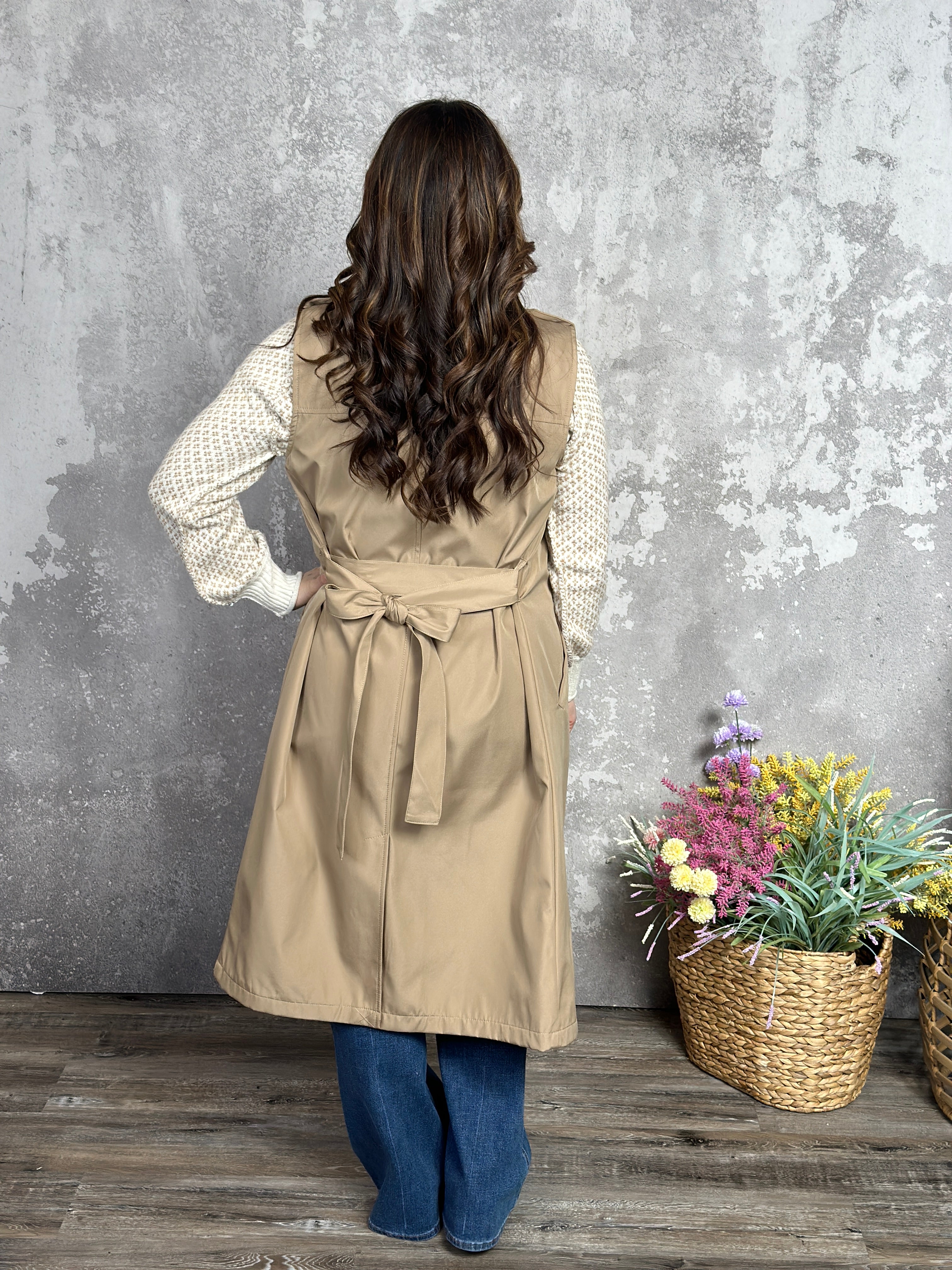 A relaxed fitting trench vest. Featuring pockets, functional front buttons and waist tie.