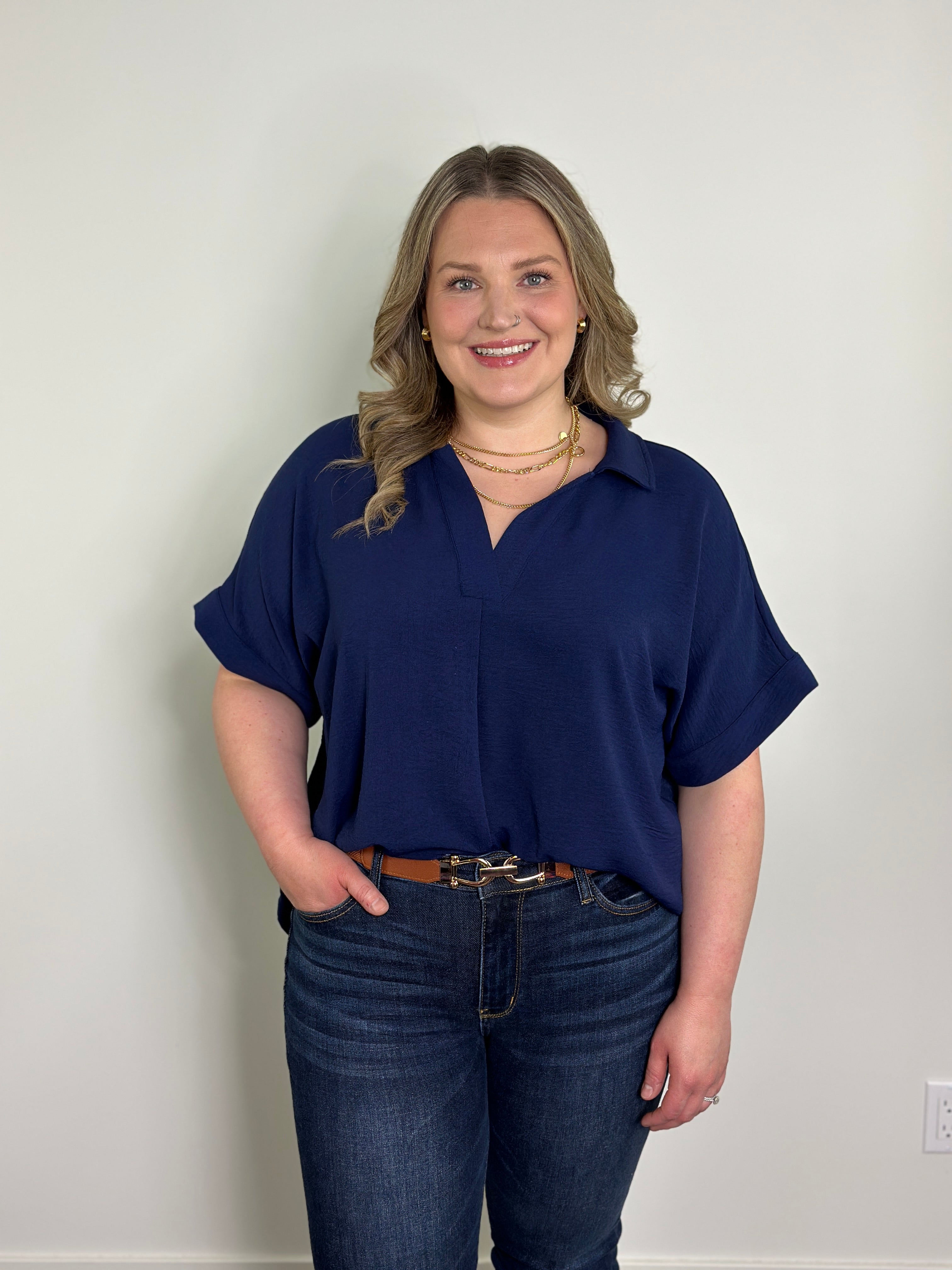 Fit:  Relaxed fit. Could size down for a more fitted look. Featuring a collar and short sleeves.