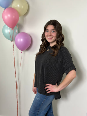 Super soft and stretchy textured ribbed neck with a round neck and Short Sleeves. Small slits on the side.