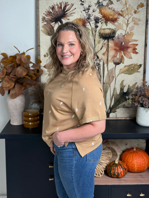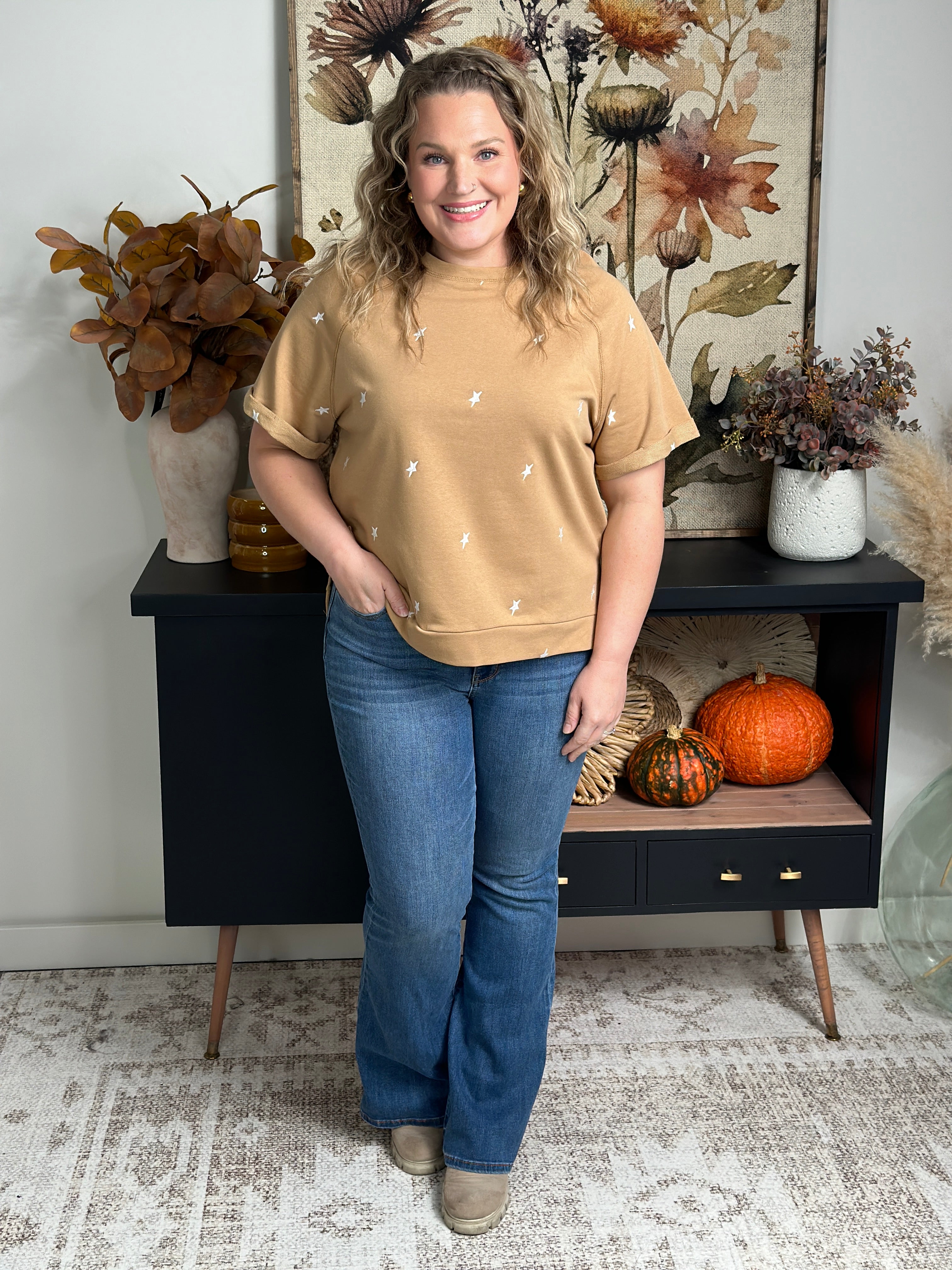 Fit: Relaxed fit thicker tee with embroidered stars.