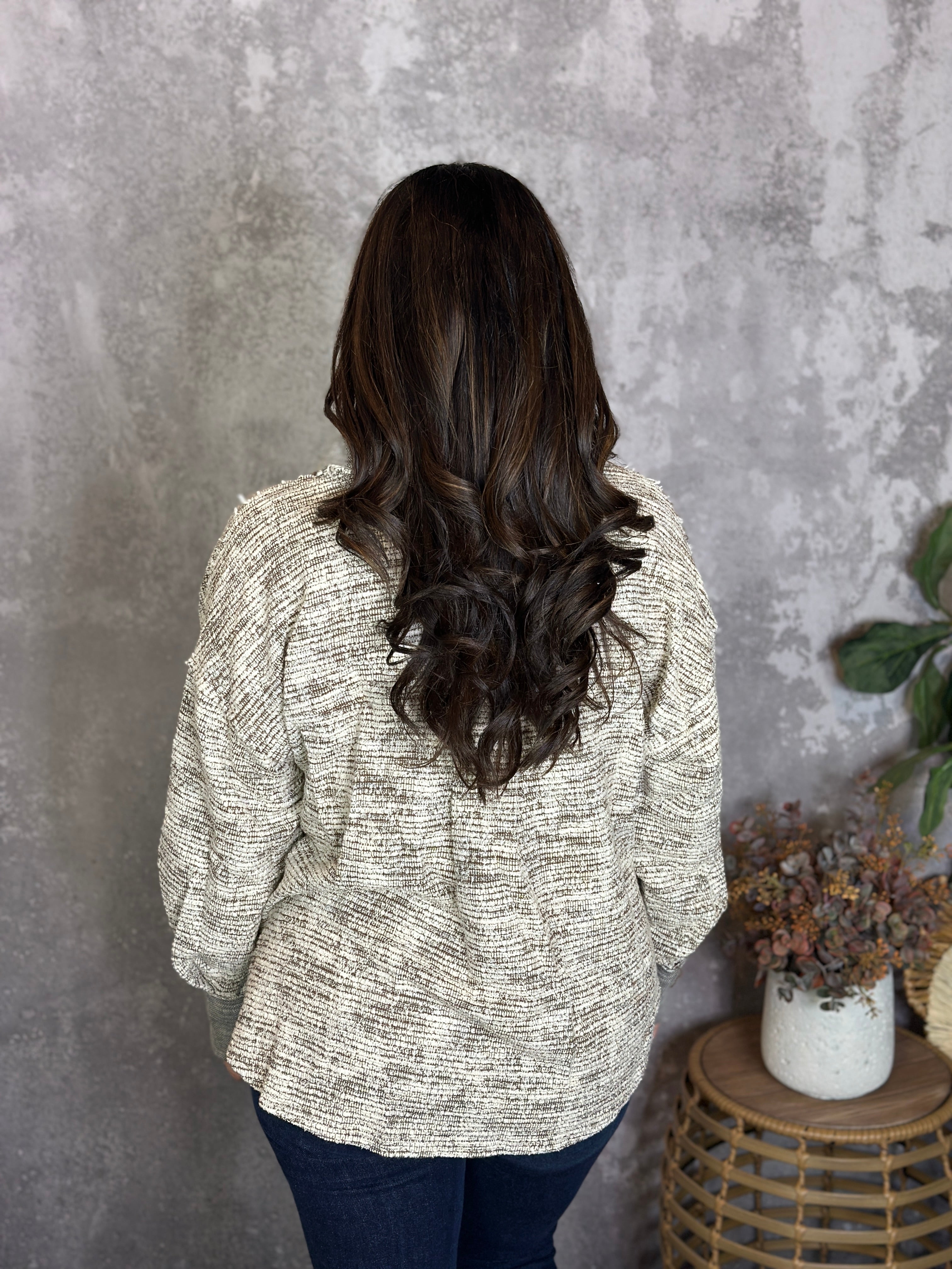 Fit: A relaxed textured long sleeve vneck top with collar.