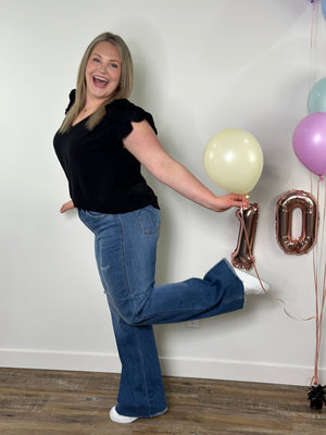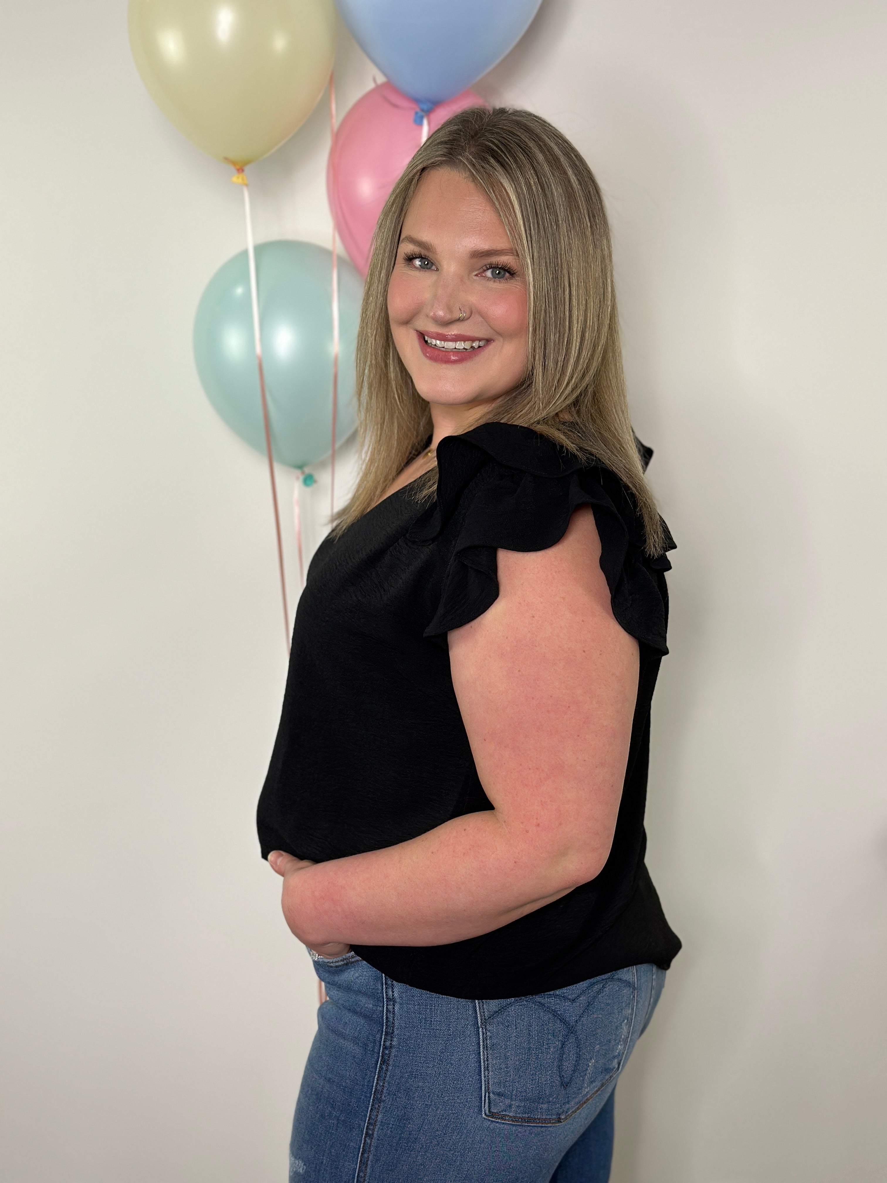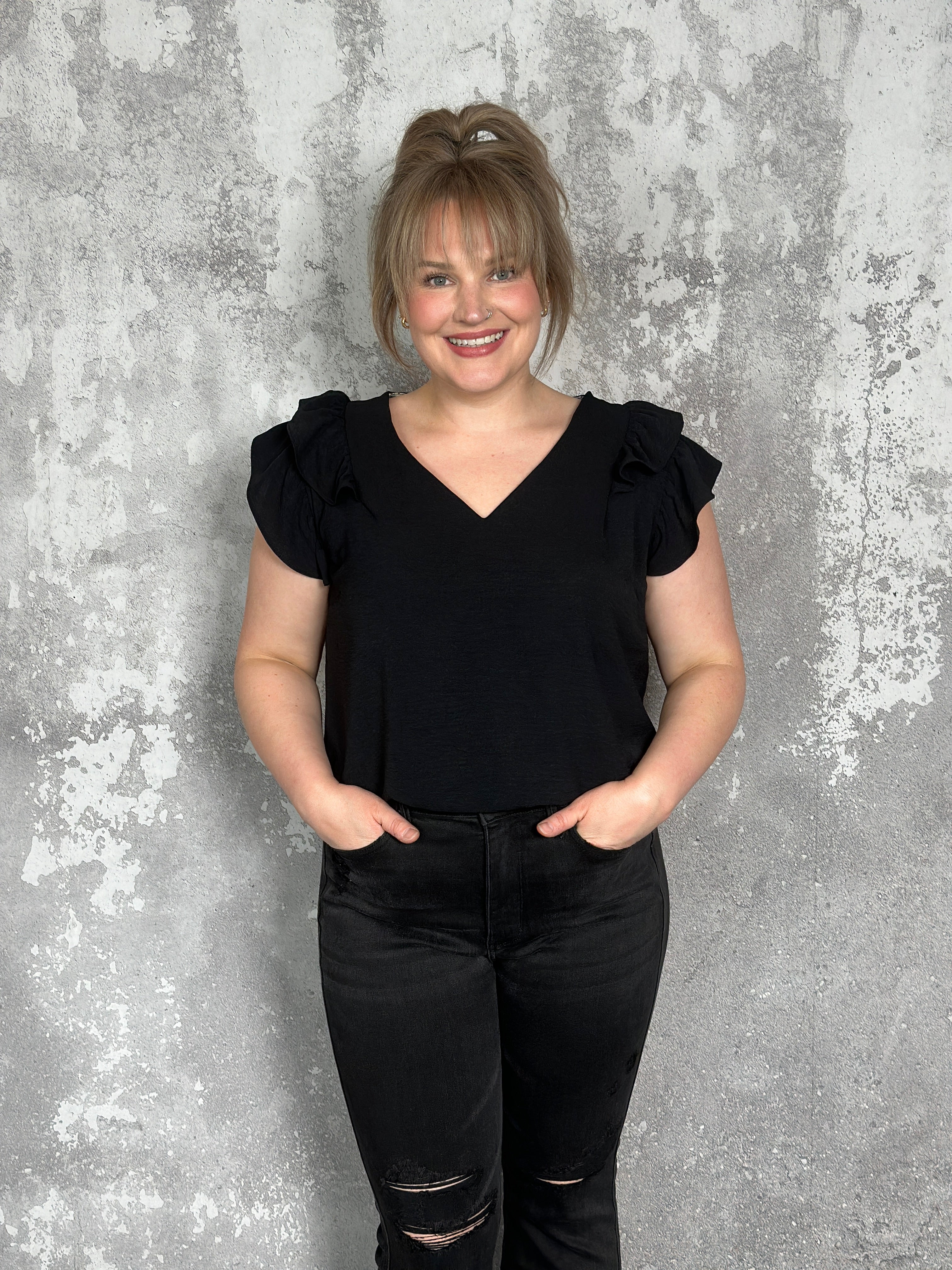 Fit: Relaxed fitting airflow vneck top with a ruffle cap sleeve. Could size down for a more fitted look.