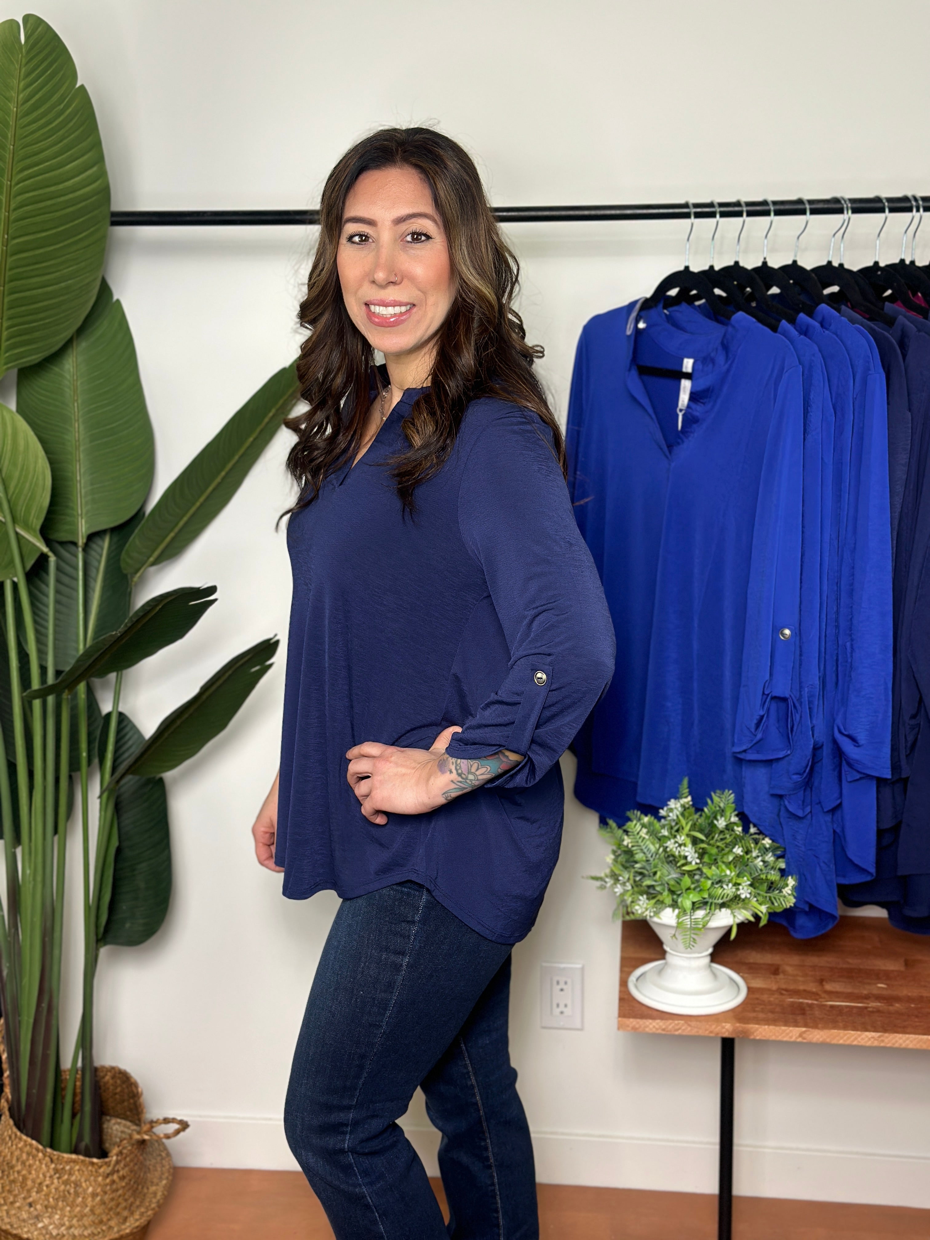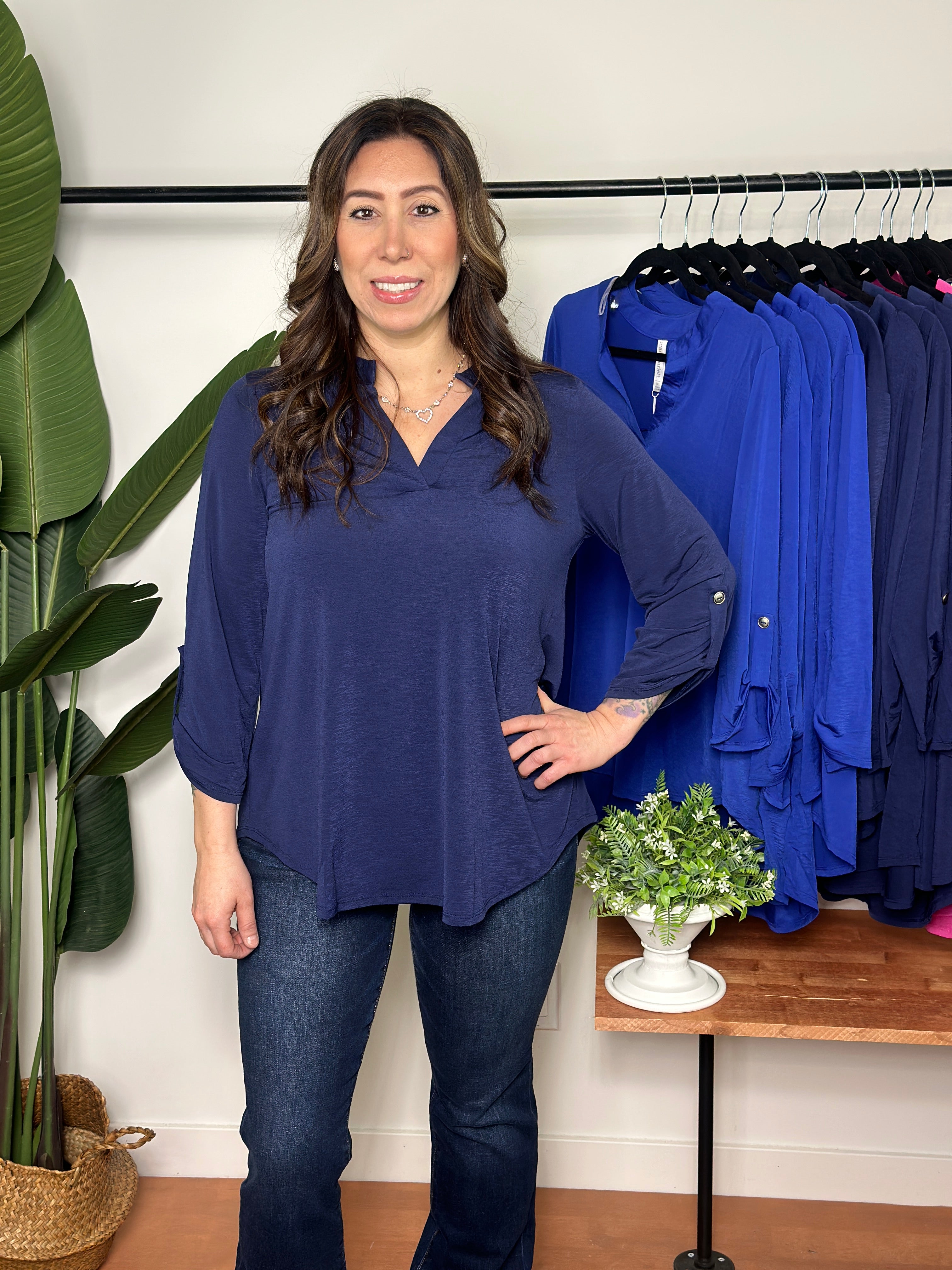 Fit: Wrinkle free 3/4 Sleeve Lizzie top. Could size down for a more fitted look as they are a flowy fit. Dress these up or down. Lightweight material and easy to wear and care for.