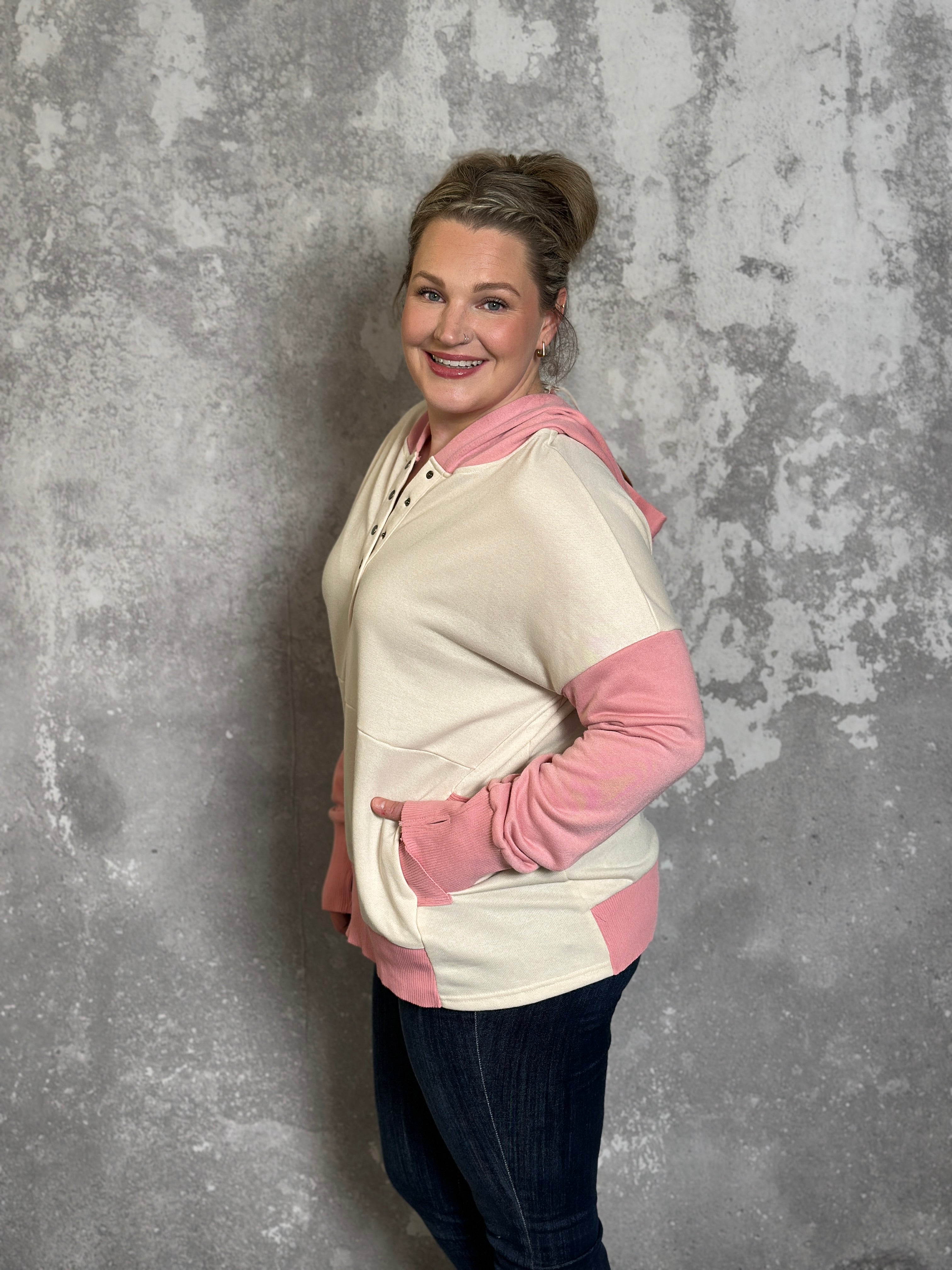 Fit: Relaxed fitting half snap hoodie sweatshirt with front pockets.