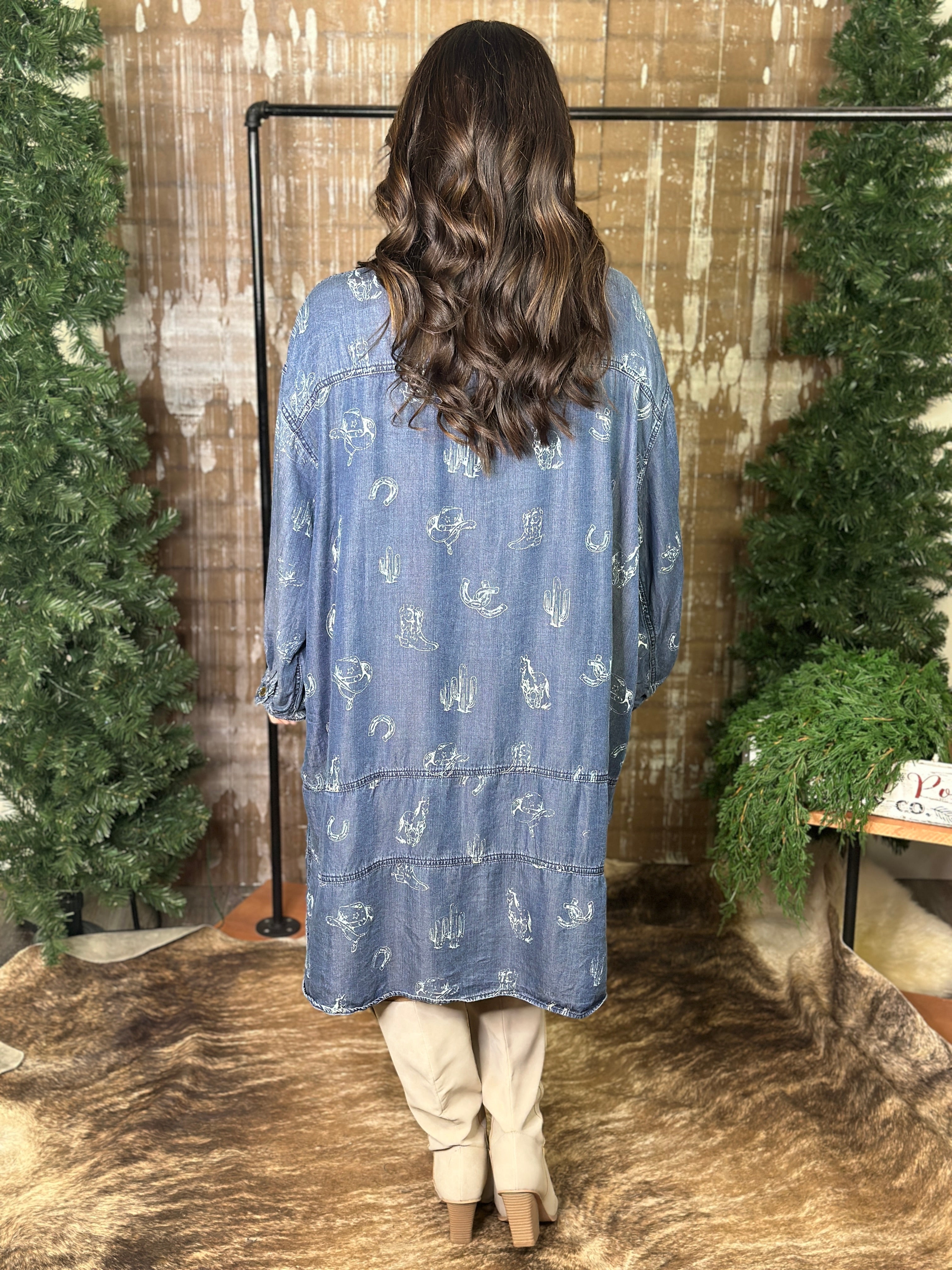 Fit: Oversized button up chambray dress with all over western print. Could size down for a more fitted look. Has functional buttons and pockets.
